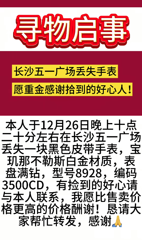 “当天晚上我们几个人又回到了五一广场寻找了两遍,没找到。”在邱女士的社交平台可看到,她曾在12月31日发布寻物启事,“本人于12月26日晚上十点二十分左右在五一广场丢失一块黑色皮带手表,宝玑那不勒斯白金材质,表盘满钻,型号8928,编码3500CD”,并称,“有捡到的好心请与本人联系,我愿比售卖价格更高的价格酬谢”。