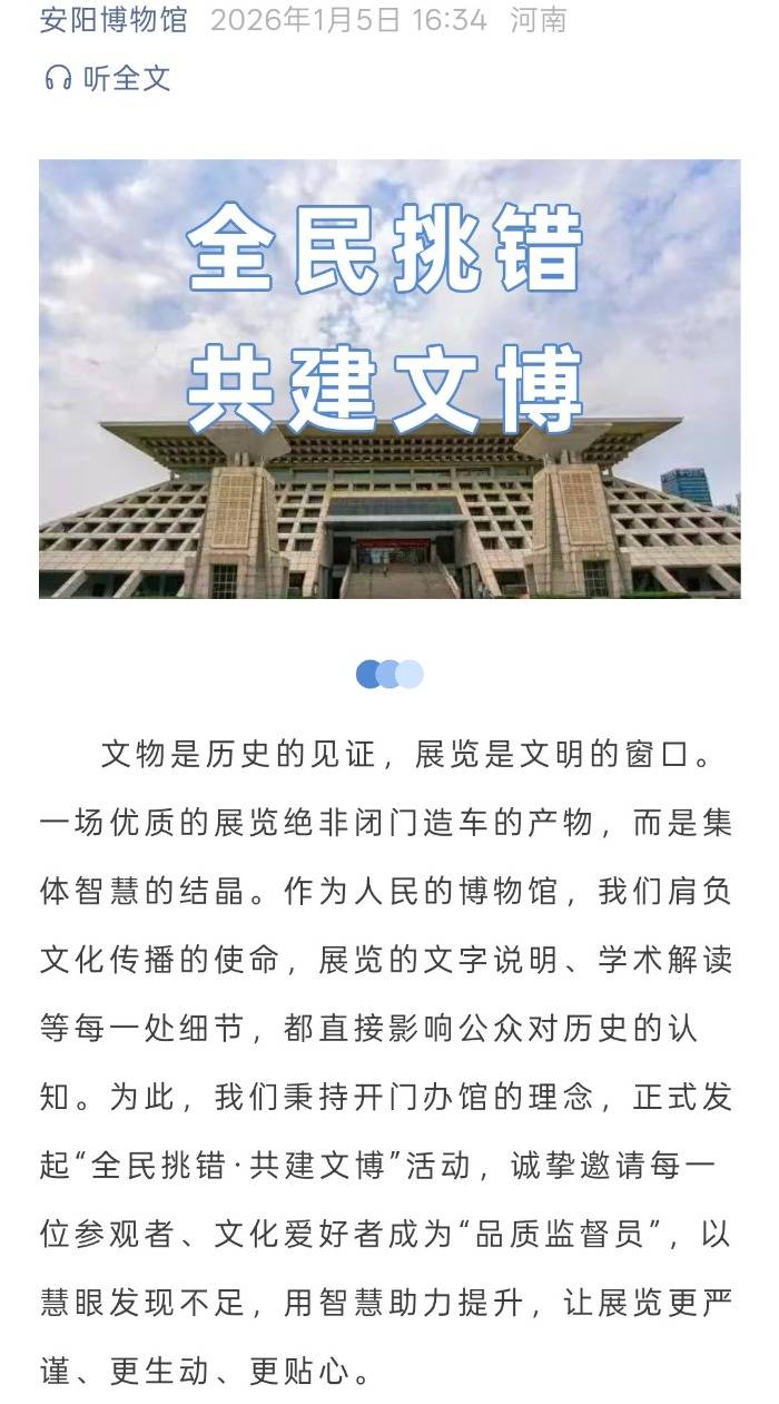 大皖新闻记者注意到,1月5日下午,安阳博物馆通过官方微信公众号发文称,正式发起“全民挑错·共建文博”活动,诚挚邀请每一位参观者、文化爱好者成为“品质监督员”,以慧眼发现不足,用智慧助力提升,让展览更严谨、更生动、更贴心。