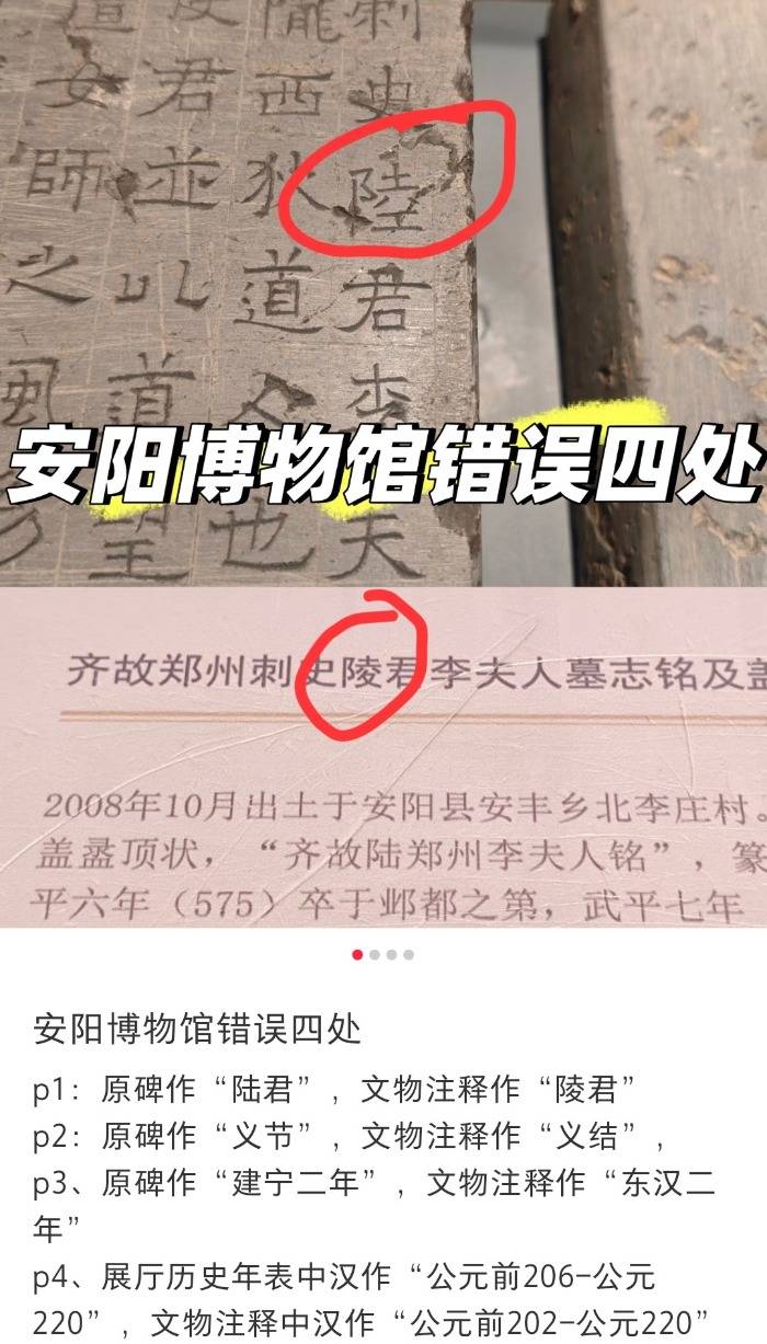 1月1日,有网民发帖称,在安阳博物馆发现4处错误,展出的原碑上写的是“陆君”,但文物注释却是“陵君”;原碑上写的是“义节”,文物注释却是“义结”;原碑写的是“建宁二年”,文物注释却是“东汉二年”;展厅历史年表中将汉代标注为“公元前206-公元220”,但文物注释中写成“公元前202-公元220”。