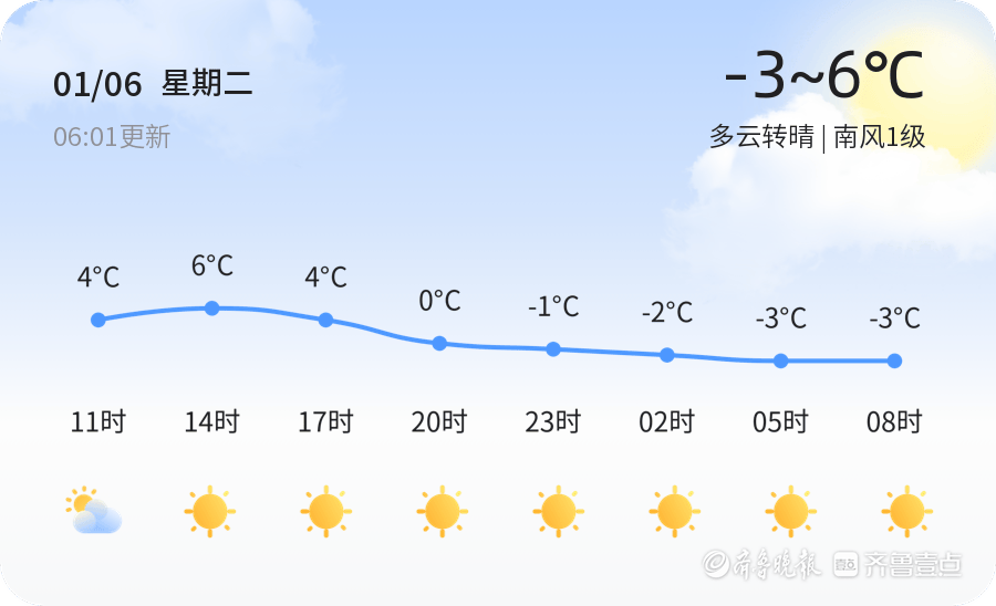 今日是2026年1月6日,星期二,农历十一月十八。淄博市今日天气多云转晴,气温在-3℃至6℃之间,南风1级,空气湿度76%。目前空气质量为中度污染,建议敏感人群减少外出,注意防护。市民出行时建议增添衣物,注意保暖,尤其是早晚温差较大,驾车请注意安全。