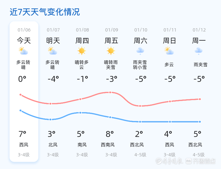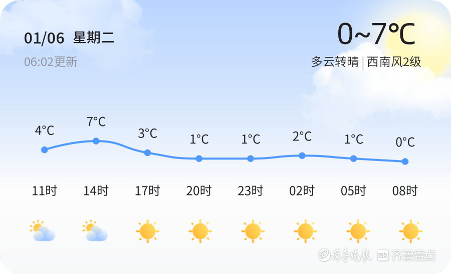 今天是1月6日,农历十一月十八,烟台市迎来多云转晴的天气。今日气温较为温和,最高气温7℃,最低气温0℃,目前实时气温为-3.7℃。全市各区天气情况一致,均为多云转晴,风力较小,西南风2级,空气湿度64%,PM2.5指数51,空气质量良好。市民朋友们在享受晴好天气的同时,仍需注意保暖,防范低温带来的不适。