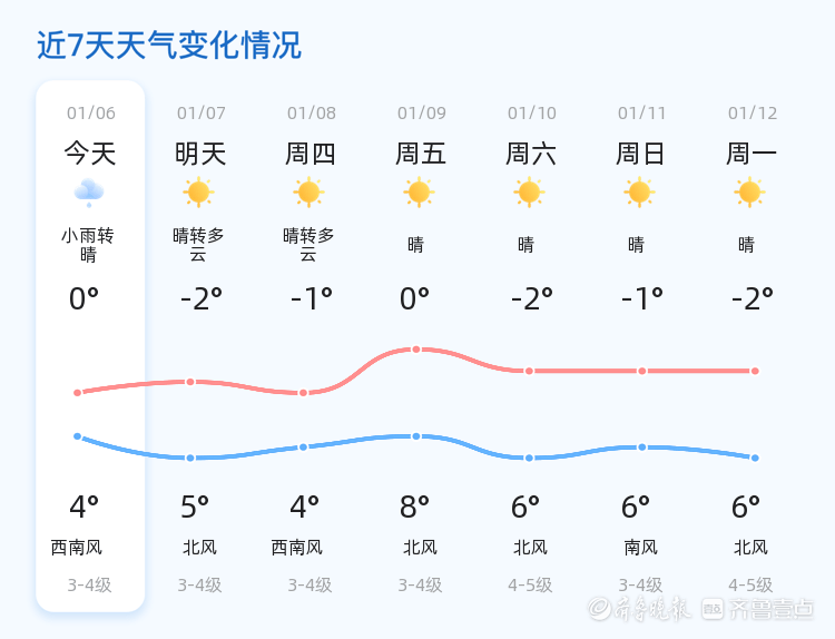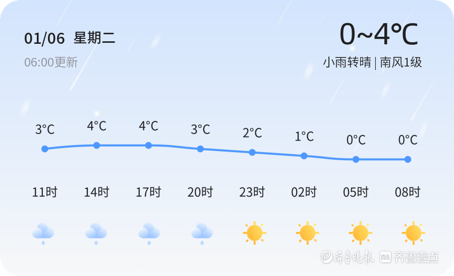 今日是2026年1月6日,农历十一月十八,星期二。青岛市迎来小雨转晴的天气,气温介于0℃至4℃之间。全市各区天气总体平稳,市民可正常出行。目前空气质量良好,PM2.5指数为58,空气湿度为69%。当前时间为6时0分,气温为0.8℃,风力较小,为南风1级。