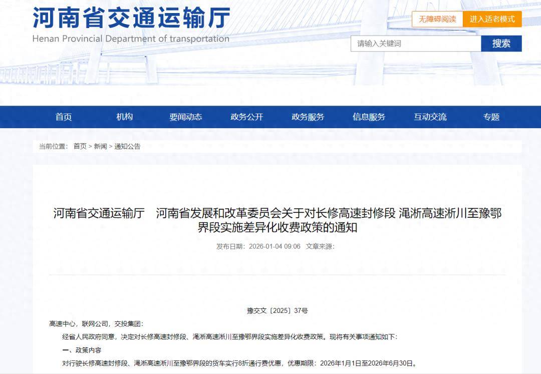 近日,河南省交通运输厅、河南省发展和改革委员会发布《关于对长修高速封修段 渑淅高速淅川至豫鄂界段实施差异化收费政策的通知》,对行驶长修高速封修段、渑淅高速淅川至豫鄂界段的货车实行8折通行费优惠,优惠期限:2026年1月1日至2026年6月30日。