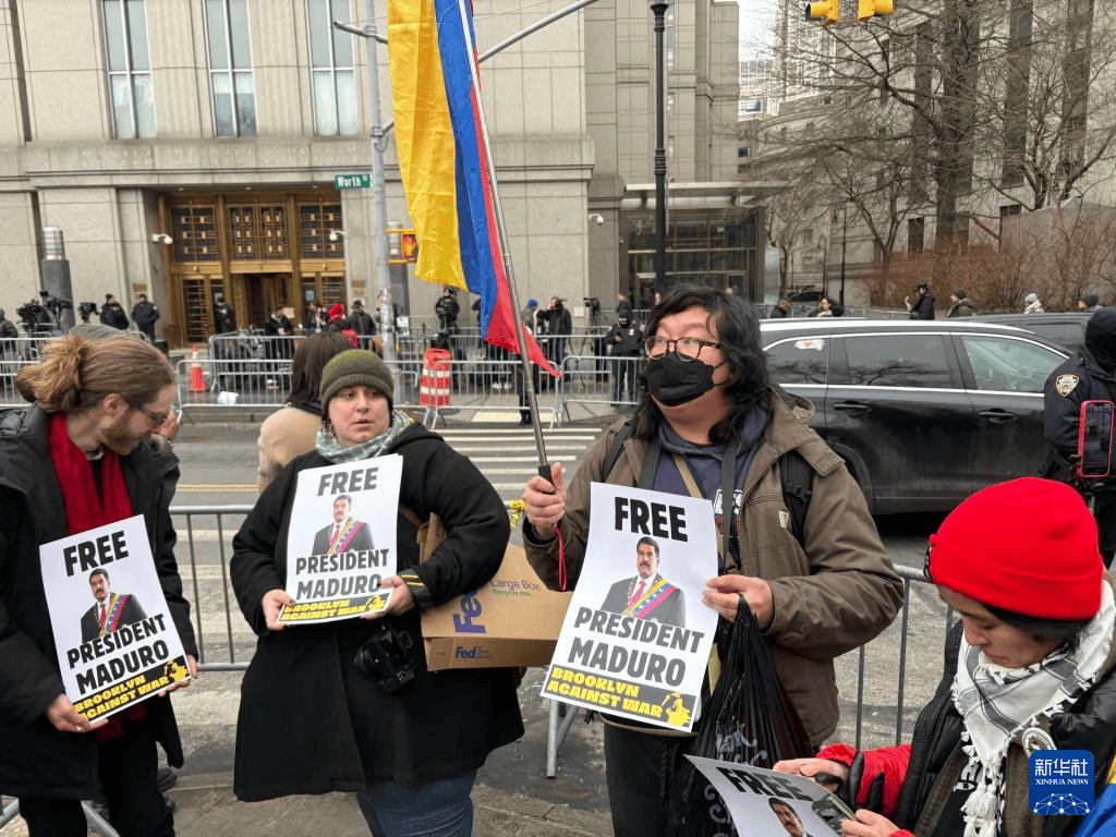 当地时间2026年1月5日,美国纽约,抗议者在南区联邦地区法院外聚集,要求“释放马杜罗”。美国东部时间5日上午,遭美国强行控制的委内瑞拉总统马杜罗被带至纽约南区联邦地区法院。新华社记者 张凤国 摄(手机照片)