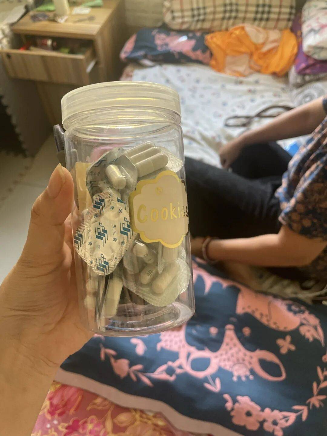 ▲贾庆娟把长乐胶囊放在罐子里藏进被窝里。新京报记者 黄依琳 摄