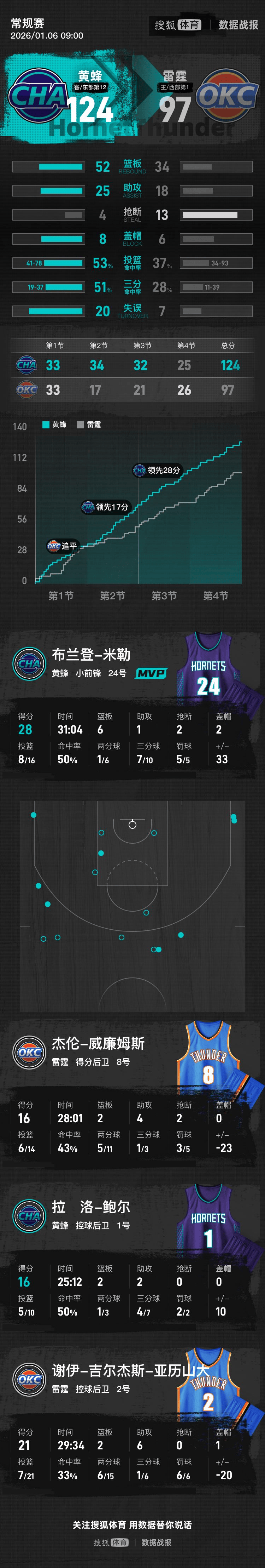 【搜狐体育战报】北京时间1月6日NBA常规赛,客场作战的黄蜂以124-97击败雷霆。布里奇斯17分11篮板4助攻,亚历山大21分2篮板6助攻。