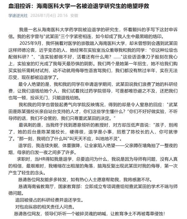 文章《血泪控诉:海南医科大学一名被迫退学研究生的绝望呼救》发表于1月4日,部分内容如下:
