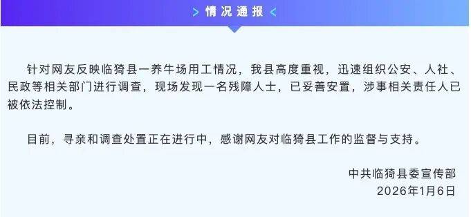 6日下午,临猗县委宣传部针对此事发布情况通报称,针对网友反映临猗县一养牛场用工情况,该县高度重视,迅速组织公安、人社、民政等相关部门进行调查,现场发现一名残障人士,已妥善安置,涉事相关责任人已被依法控制。目前,寻亲和调查处置正在进行中。