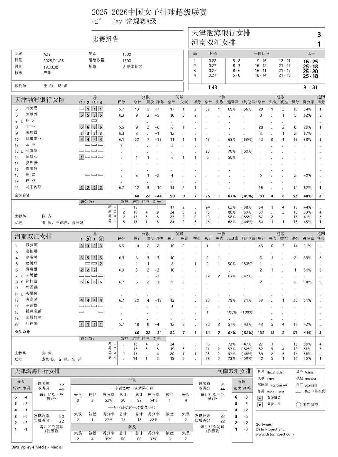 北京时间1月6日,中国女排超级联赛常规赛A级第七轮迎来焦点之战,天津渤海银行女排坐镇主场迎战河南双汇女排,在首局失利的不利局面下,天津女排逐渐找回状态,连扳三局,以3-1(16-25、25-18、25-20、25-18)完成逆转,迎来一波三连胜,本场比赛过后,天津队战绩为5胜2负积15分,继续在积分榜前列保持竞争力,而河南队则遭遇第五败,仅积5分,局势略显被动。