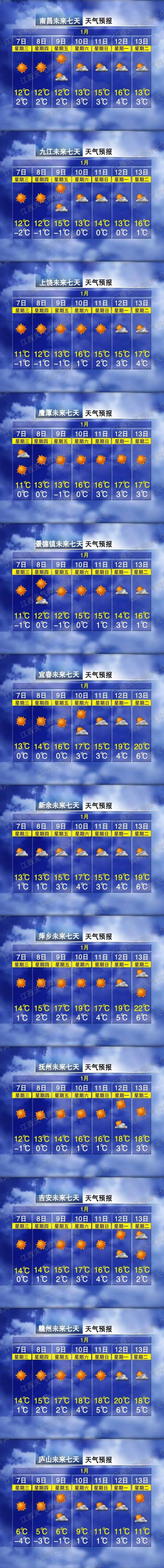据江西省气象部门监测 下午2点 全省气温平均10.6℃ 较昨日同期上升3.1℃ 更重要的是 预计未来10天 全省多地 还将以晴朗升温的格局为主 以萍乡天气为例 下周二(13日) 最高气温将达到22℃ 恍若春日 不过 赣北北部的朋友们 还是别大意! 两股冷空气已经在路上了 据悉 1月10日 受一股弱冷空气扩散南下影响 气温会略有下降 12-13日 受干冷空气影响 全省多云间晴天 部分地区气温有所下降 风力加大 以九江天气为例 1月10日至12日 最低气温都在0℃左右 大家外出时依然要做好保暖工作 建议洋葱式穿搭 在温差大的环境下 可随意切换薄厚衣物 以防感冒
