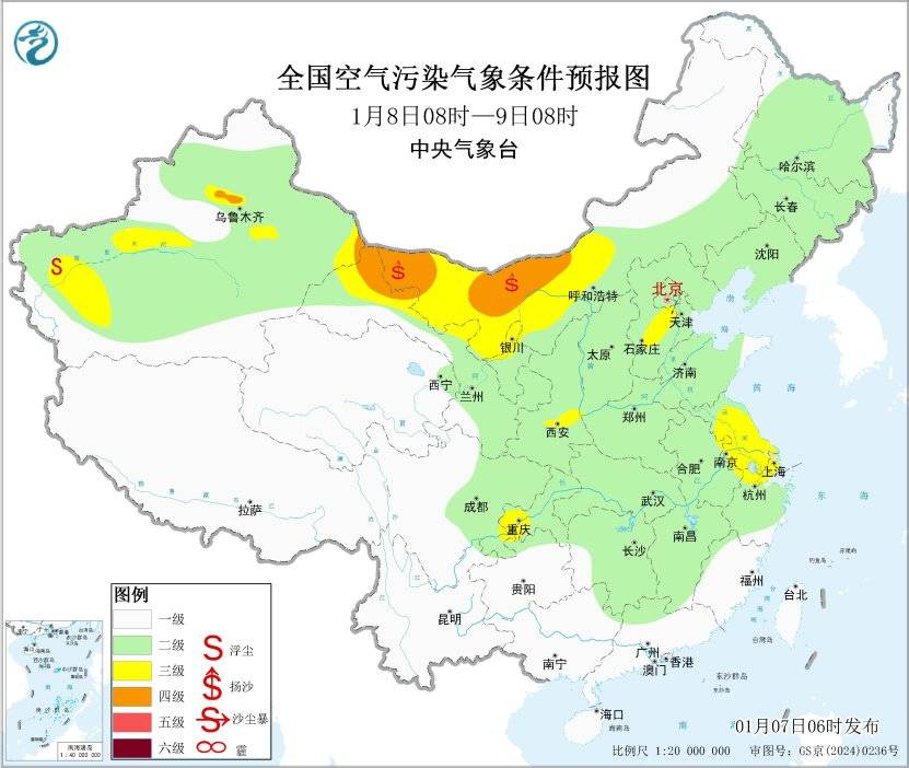 8日至10日,受冷空气大风影响,内蒙古中西部、甘肃西部、宁夏、陕西北部、山西北部、河北、山东等地的部分地区有扬沙或浮尘天气。
