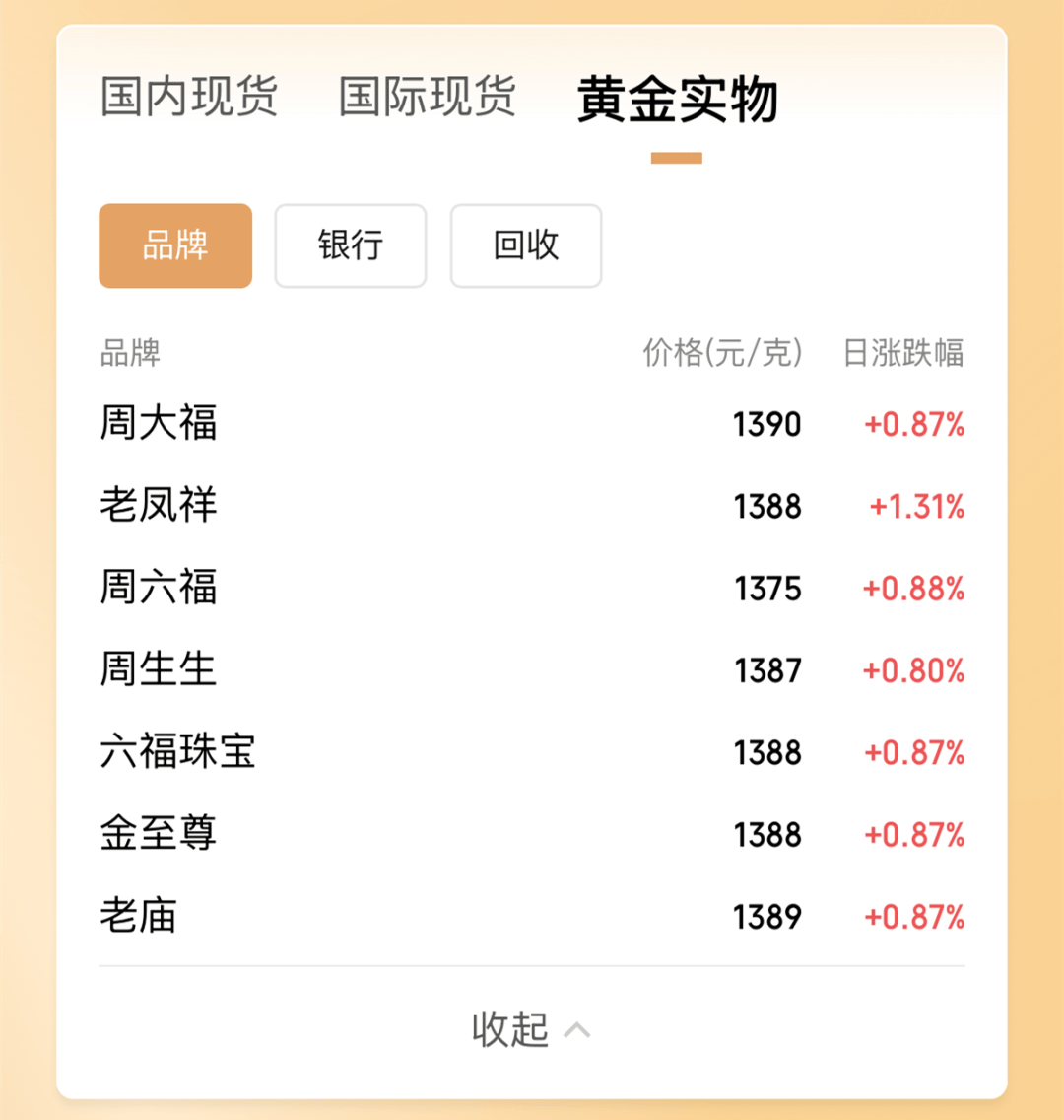国内金饰价格也应声飙升,据腾讯理财通最新数据,周大福已涨至1390元/克,老庙紧随其后,报1389元/克,老凤祥、金至尊和六福珠宝报1388元/克,周生生也达到了1387元/克。