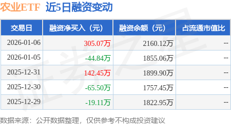 证券之星消息,1月6日,农业ETF(159825)融资买入699.64万元,融资偿还394.57万元,融资净买入305.07万元,融资余额2160.12万元。