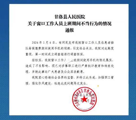 近日,四川甘洛一医院收费员因玩手机致使多人排队待缴费引发热议。对此,甘洛县人民医院通报称:2026年1月6日,有网民发布我院窗口工作人员在患者排队等候缴费期间使用手机的视频,引发社会关注。经核实,我院窗口工作人员上班期间使用手机的情况属实,造成了不良影响,现已对涉事职工进行严肃批评教育和待岗处理,并就此事向广大患者及公众深表歉意。(据1月6日北京日报报道)