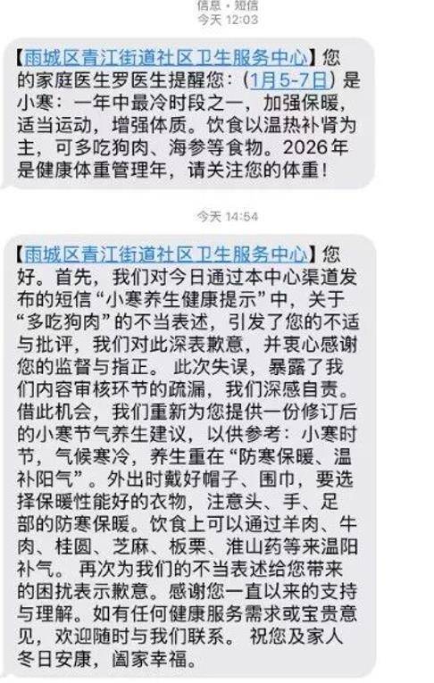 1月5日,有网友晒出了四川省雅安市雨城区青江街道社区卫生服务中心发送的一则短信。短信内容主要是健康提醒,其中写道:“小寒是一年中最冷时段之一,为加强保暖,适当运动,增强体质。饮食以温热补肾为主,可多吃狗肉、海参等食物。”