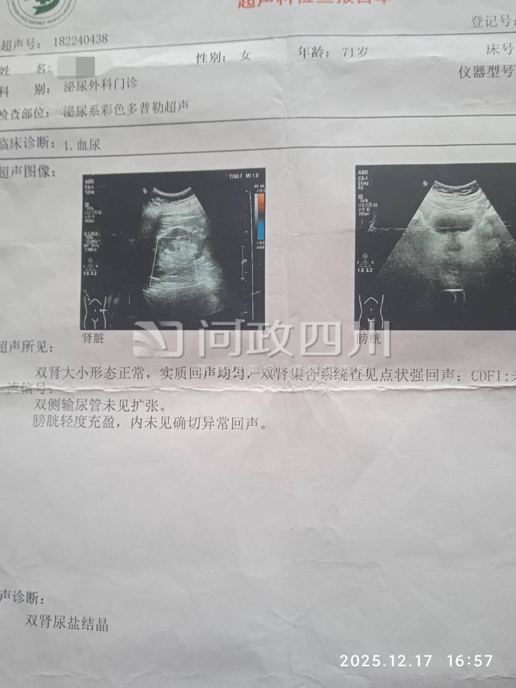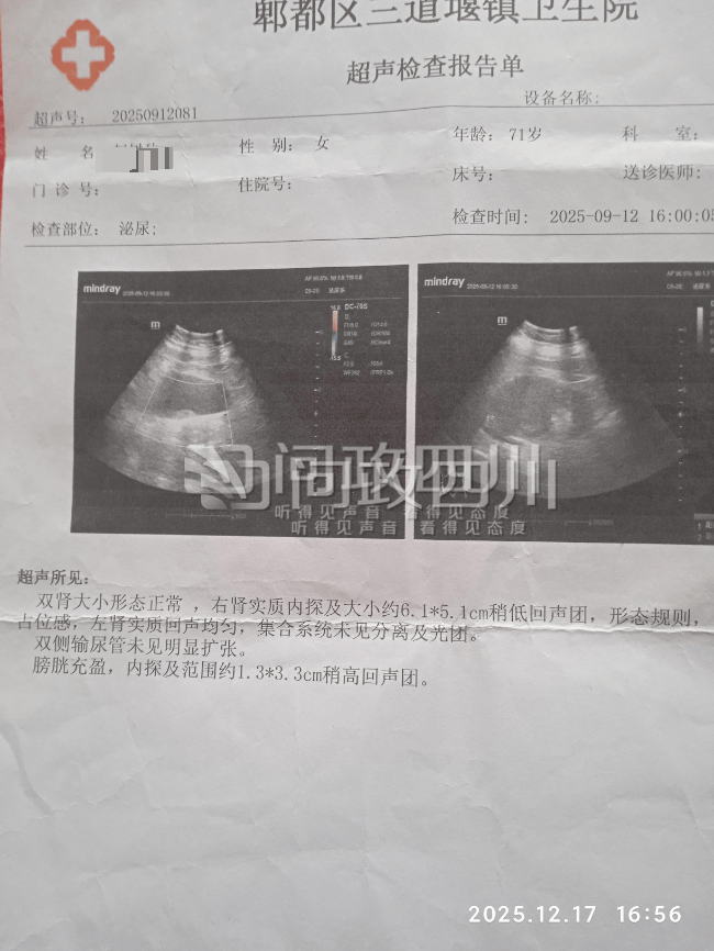12月17日,前述四川省成都市郫都区市民在“问政四川”网络平台留言称:71岁的老伴9月12日发现血尿,在郫都区三道堰镇卫生院检查超声报告为右肾占位,遵医嘱去上一级医院进一步检查。9月13日,在郫都区人民医院检查结果显示双肾正常,医生诊断为泌尿道感染,便按尿道炎进行治疗。