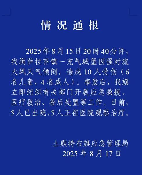 红星新闻记者注意到,去年8月17日,土默特右旗应急管理局发布情况通报:“2025年8月15日,我旗萨拉齐镇一充气城堡因强对流大风天气倾倒,造成10人受伤(6名儿童、4名成人)。事发后,我旗立即组织有关部门开展应急救援、医疗救治、善后处置等工作。目前,5人已出院,5人正在医院观察治疗。”