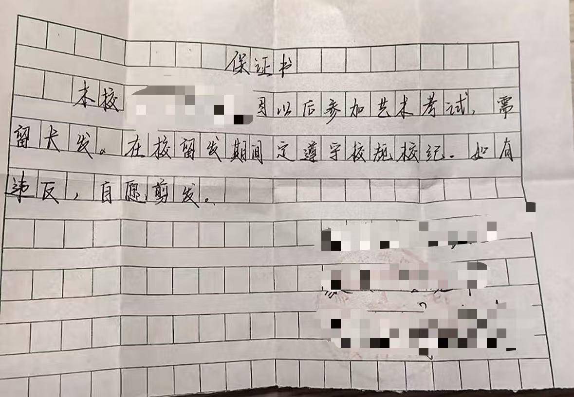 该学生发布的“证明”写道,“石家庄第四十中学某班某学生在我校学习绘画艺术专业课程,因专业需要需留长发。”随后,该生又发布了一份“保证书”,配文称“尘埃落定”。保证书内容显示,“本校某学生,因以后参加艺术考试,需留长发。在校留发期间定遵守校规校纪。如有违反,自愿剪发。”该保证书右下方有学生、家长及班主任签字,并盖有学校公章。