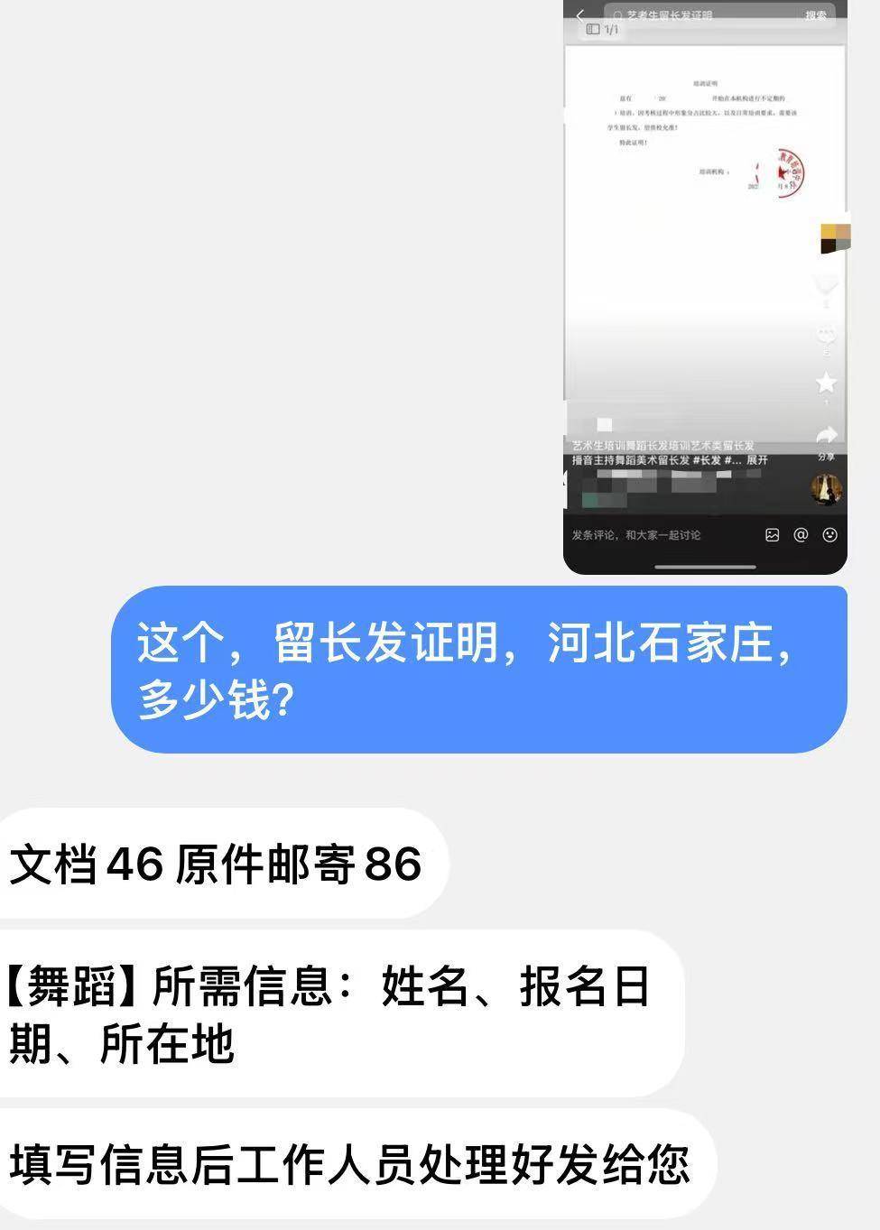 极目新闻记者查询发现,网络中有专门开具“留发证明”的相关渠道。记者以消费者身份咨询,对方表示需要提供姓名、报名日期、所在地,费用为一份文档46元,原件邮寄86元。