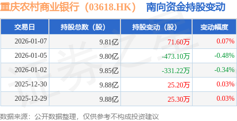 证券之星消息,1月7日南向资金增持71.6万股重庆农村商业银行(03618.HK)。近5个交易日中,获南向资金减持的有2天,累计净减持682.22万股。近20个交易日中,获南向资金减持的有14天,累计净减持5441.8万股。截至目前,南向资金持有重庆农村商业银行(03618.HK)9.81亿股,占公司已发行普通股的39.02%。