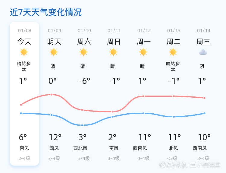 今天是1月8日,星期四,农历十一月二十。济南市迎来晴转多云的天气,气温在1℃到6℃之间,东南风2级,空气湿度47%,空气质量良好。各区天气情况总体稳定,市民出行条件良好。