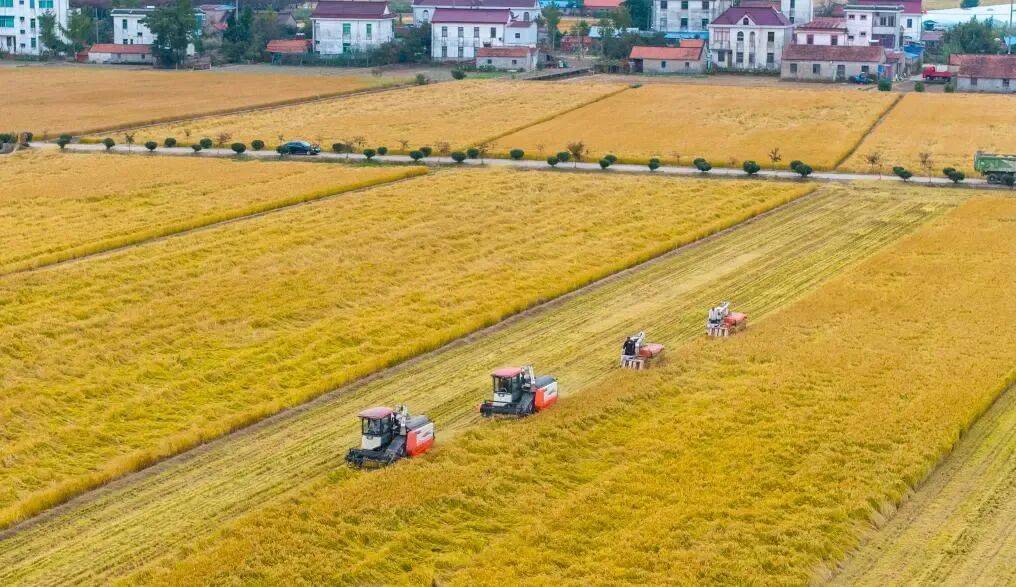 在江苏省南通市通州区十总镇育民村高标准农田里,村民驾驶农机收割水稻。 图源:新华社
