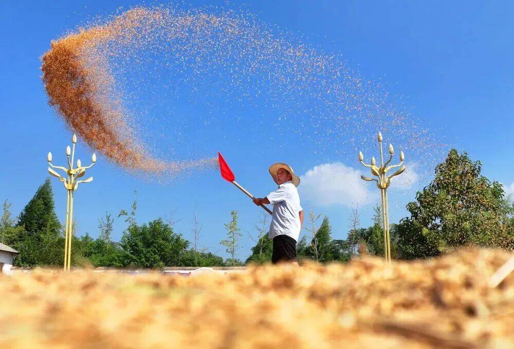 湖南省衡阳市衡山县萱洲镇农民在晾晒稻谷。图源:新华社