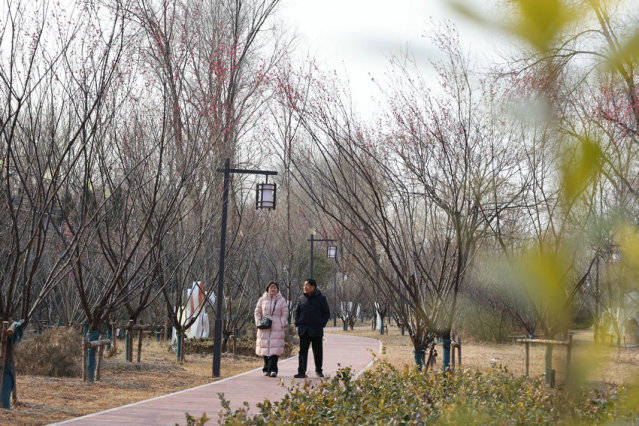1月6日,开封市环城公园梅花园的腊梅、宫粉梅等梅花陆续绽放,微风摇曳,花香四溢,市民来到此处休闲赏花,享受冬日慢时光。全媒体记者石斐摄