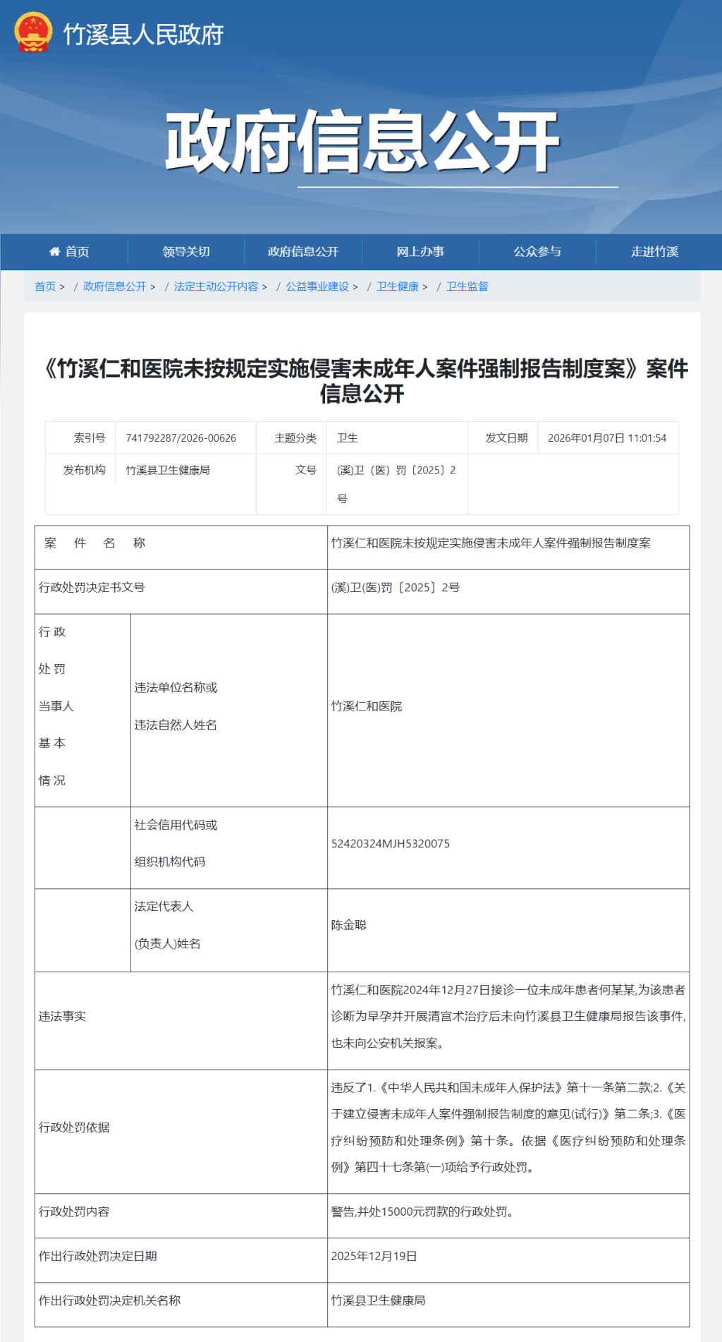 湖北省十堰市竹溪仁和医院发现一位未成年人被侵害后,为其开展清宫术治疗,未按规定实施侵害未成年人案件强制报告制度,被竹溪县卫生健康局处以警告及15000元罚款的行政处罚。竹溪县人民政府网站“政府信息公开”栏目1月7日公布了这则案件。