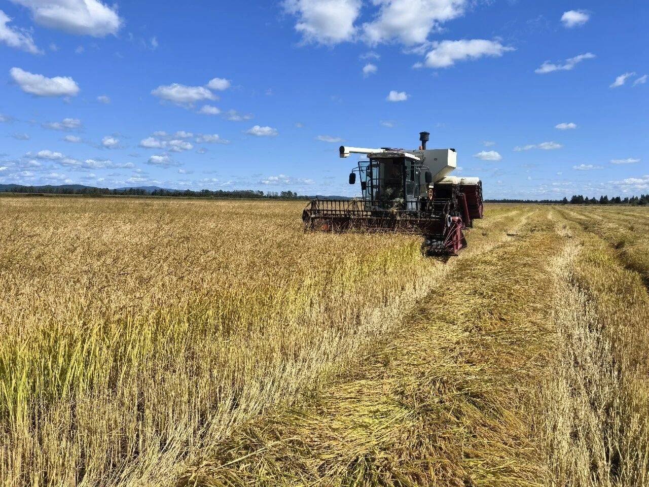 新农机设备应用于水稻割晒(八五四分公司供图)