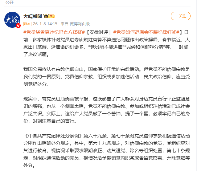 #党员烧香算违纪吗官方释疑#【安徽时评 | #党员如何逛庙会不踩纪律红线#】日前,多家媒体针对党员进寺庙烧炷香算不算违纪问题作出政策解释。春节临近,大家出门旅游、逛庙会的机会多,“党员能不能进庙”“民俗和信仰咋分清”等,一时成了热议话题。
