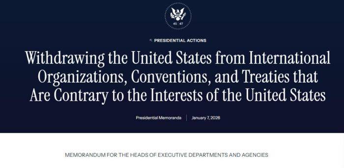 声明写道,特朗普特此指示所有行政部门和机构立即采取措施,让美国尽快退出相关组织。就联合国框架下的多边机构和实体而言,退出是指在法律允许的范围内停止参与或资助这些实体。