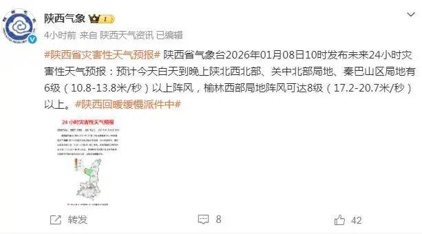 预计今天白天到晚上陕北西北部、关中北部局地、秦巴山区局地有6级(10.8-13.8米/秒)以上阵风,榆林西部局地阵风可达8级(17.2-20.7米/秒)以上。