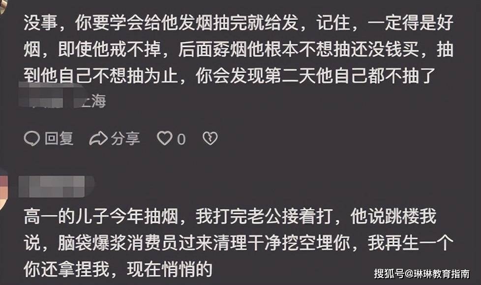 评论区另一位高一学生的家长分享:发现儿子吸烟后,夫妻二人直接混合双打!孩子闹着要跳楼,家长直截了当地表示,大不了我再生一个,孩子看父母这么说,反而偃旗息鼓,老老实实地把烟给戒掉了。