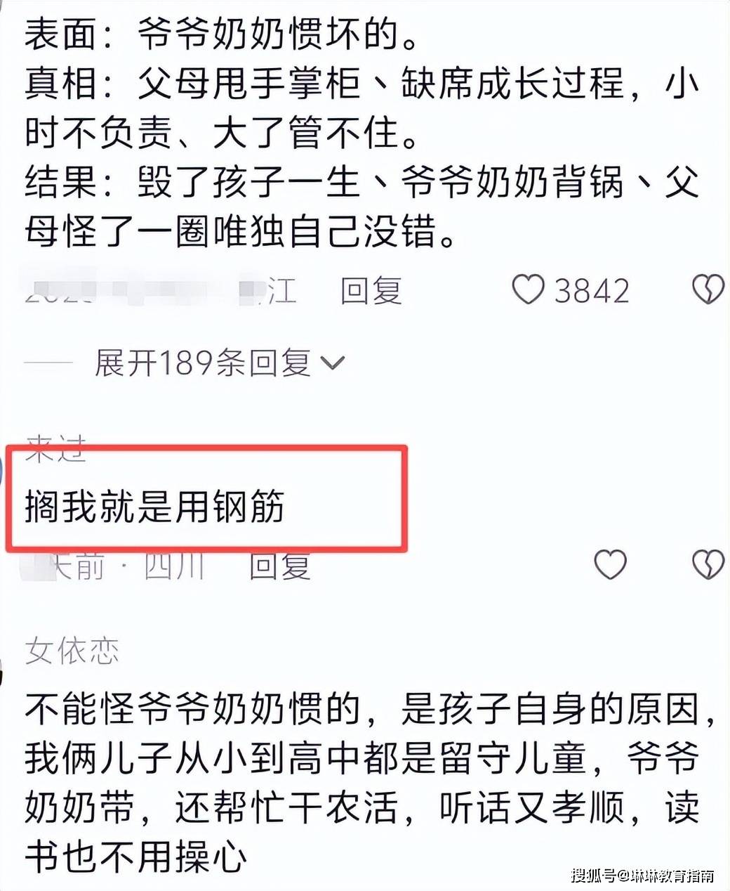 可问题的关键就在于,很多家长既不想打孩子,也不想动脑筋去思考如何教育孩子,结果就是现在这样:把孩子给养废了,怪爷爷奶奶溺爱,怪孩子不争气,却完全没考虑是自己的失职,才造成了如今的局面。