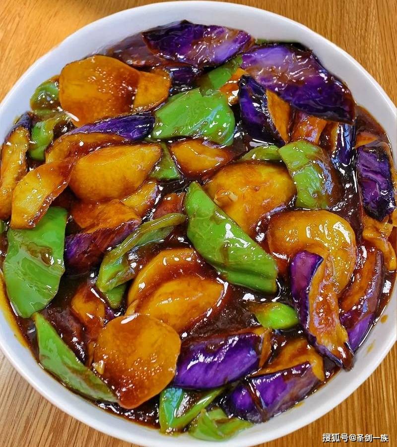 5. 加入炸好的茄子和土豆,倒入酱汁,翻炒均匀,使食材裹上酱汁即可。