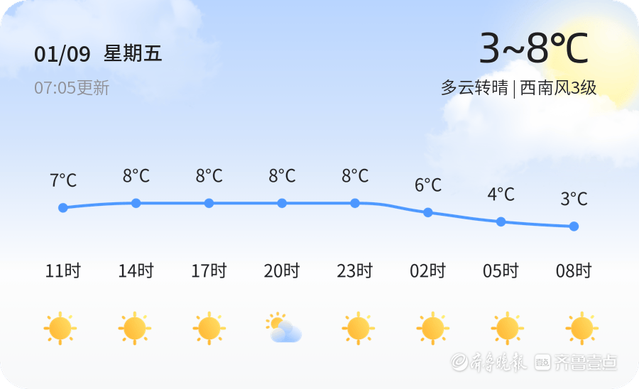 今天是2026年1月9日,农历十一月廿一,星期五。青岛市今天天气以多云转晴为主,气温适中,最高气温8℃,最低气温3℃。目前空气质量良好,PM2.5浓度为65,属于良好水平。风力方面,今日以西南风3级为主,风速适中。市民外出时建议随身携带雨具,以备不时之需。