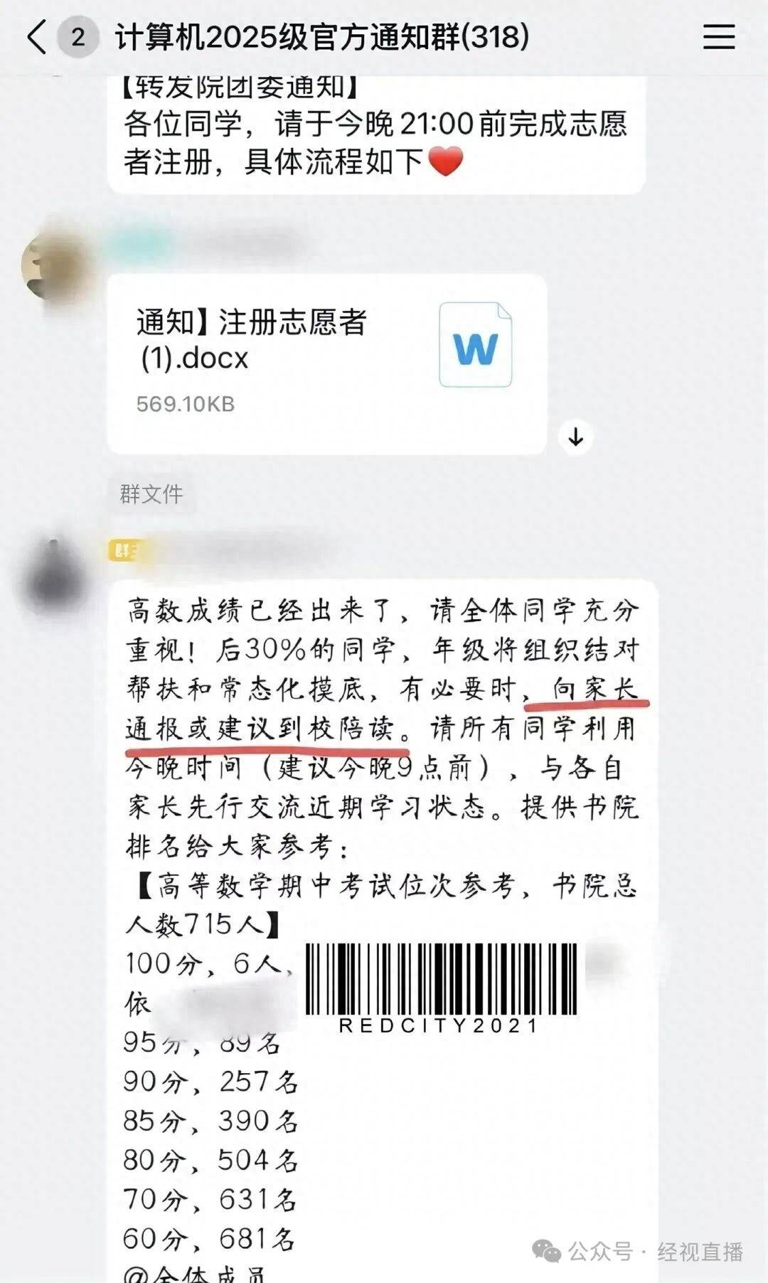 近日,有网友发文称,南京理工大学致知书院计算机2025级官方群内发布一则通知,其中提到:高数成绩现已公布,排名后30%的同学,年级将组织结对帮扶与常态化摸底,“必要时会向家长通报,或建议到校陪读”。通知还附有高数期中考试成绩位次参考,并提醒所有同学与家长提前沟通近期学习状态。