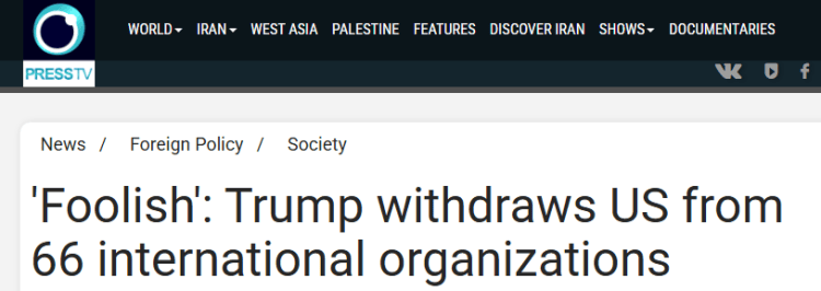 伊朗英语新闻电视台的报道认为,美国这一决定是美国政府对国际合作长期怀疑态度的最新表现,其根源在于“让美国再次伟大”口号,这种态度已日益转化为退出全球规则与标准谈判平台的行动。