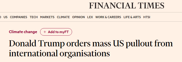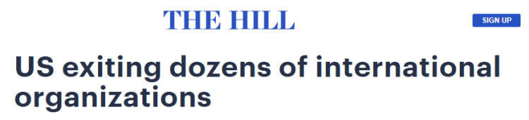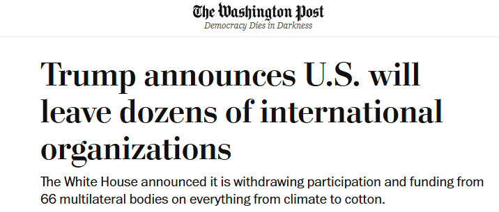 《华盛顿邮报》的报道指出,美国将退出数十个与联合国相关的国际组织,标志着华盛顿从气候变化到棉花贸易等全球合作领域的全面收缩。报道援引国际危机组织驻联合国主任理查德·高恩的观点指出,美国似乎正在退出那些促进国际法、经济发展、环境合作与性别平等的组织。
