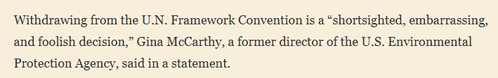 报道援引美国环境保护署前署长吉娜·麦卡锡的表态称,退出《联合国气候变化框架公约》是一个“目光短浅、令人尴尬且愚蠢的决定”。“美国政府正在放弃美国数十年来在气候变化领域的领导力和全球合作方面的经验。”