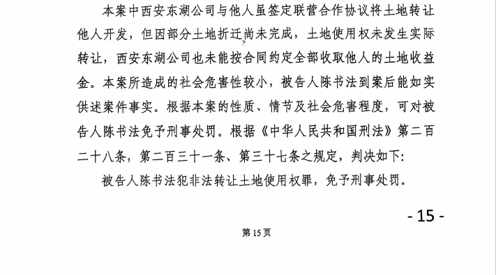 一审法院最终判决,陈书法犯非法转让土地使用权罪,免予刑事处罚。