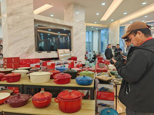 “一块铁锭,如何变成一口走向世界的锅?”带着这样的好奇,采风团成员首站走进河南华邦电器炊具有限公司。生产车间内,炽热的铁水注入精密模具,瞬间定型为锅具雏形,阵阵热浪中,工人熟练地进行打磨、检测。“我们年产优质铸铁炊具600余万口,累计服务家庭近1.2亿个。”该公司外贸经理汪龙介绍,自1994年建厂以来,华邦深耕铸铁炊具领域,其率先研发推广的“金属模具压铸技术”已成为行业标准工艺,产品不仅覆盖全国,更远销欧美四十多个国家和地区。走进展品区,各种类型的铸铁锅排列整齐,器型沉稳、釉色丰润、触感温厚。手握沉甸甸的锅具,采风团成员直观感受到了“郏县制造”的温度与实力。