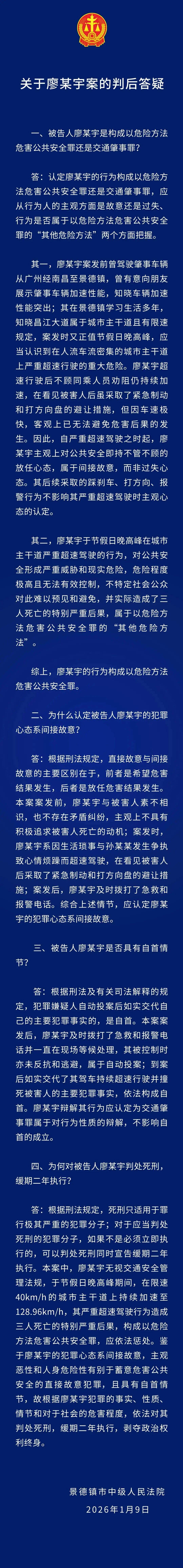 答疑中表示,根据刑法规定,死刑只适用于罪行极其严重的犯罪分子,对于应当判处死刑的犯罪分子,如果不是必须立即执行的,可以判处死刑同时宣告缓期二年执行。本案中,廖某宇无视交通安全管理法规,于节假日晚高峰期间,在限速40km/h的城市主干道上持续加速至128.96km/h,其严重超速驾驶行为造成三人死亡的特别严重后果,构成以危险方法危害公共安全罪,应依法惩处。鉴于廖某宇的犯罪心态系间接故意,主观恶性和人身危险性有别于蓄意危害公共安全的直接故意犯罪,且具有自首情节,故根据廖某宇犯罪的事实、性质、情节和对于社会的危害程度,依法对其判处死刑,缓期二年执行,剥夺政治权利终身。