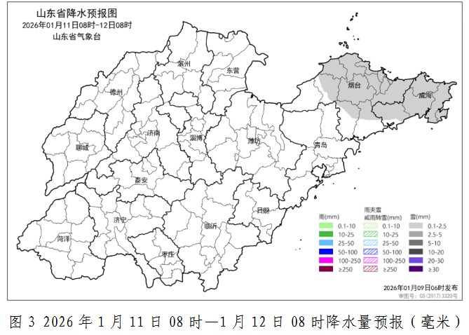 11日白天到夜间,烟台北部和威海天气阴有小雪转多云,其他地区天气晴到少云。