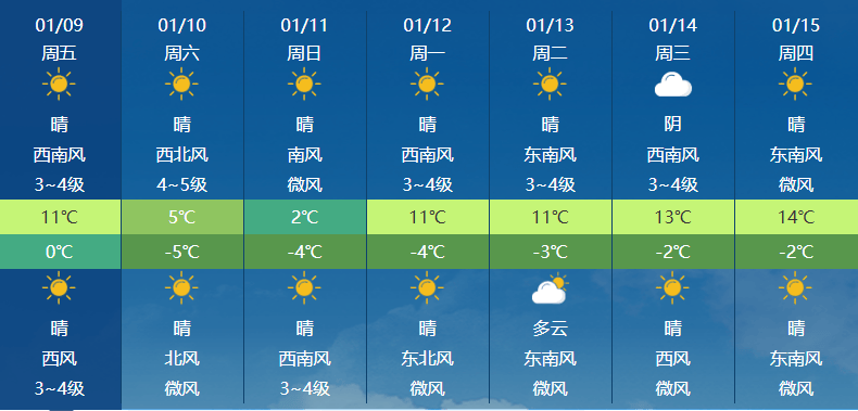10日白天到夜间,晴间多云,偏北风4~5级 阵风6~7级逐渐减弱至3~4级,气温5~-5℃;