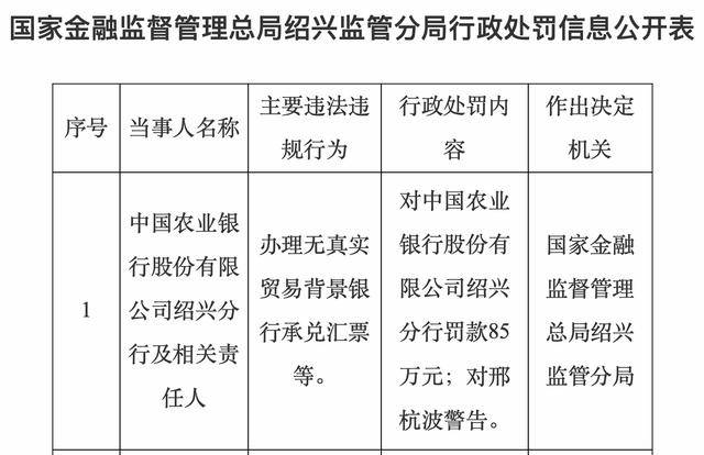 1月8日,国家金融监督管理总局绍兴监管分局发布行政处罚信息显示,中国农业银行股份有限公司绍兴分行及相关责任人,因办理无真实贸易背景银行承兑汇票等,对中国农业银行股份有限公司绍兴分行罚款85万元,对邢杭波警告。