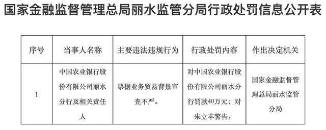 1月8日,国家金融监督管理总局丽水监管分局发布行政处罚信息,中国农业银行股份有限公司丽水分行及相关责任人,因票据业务贸易背景审查不严,对中国农业银行股份有限公司丽水分行罚款40万元;对朱立丰警告。