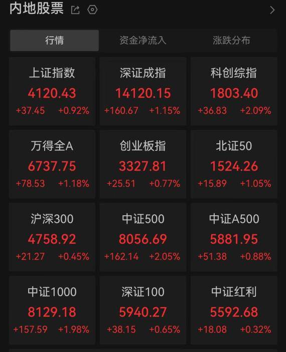 截至收盘,沪指涨0.92%报4120.43点,深成指涨1.15%报14120.15点,创业板指涨0.77%报3327.81点。市场全天成交额约3.15万亿元,较前一交易日大幅放量。