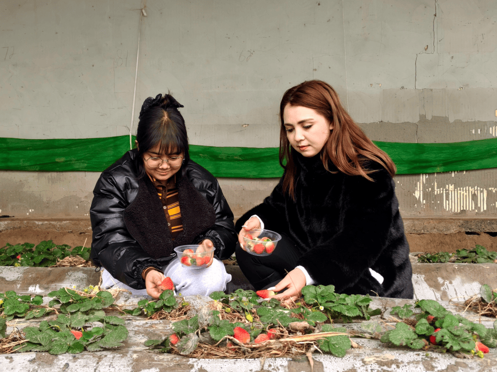 除了各类蔬菜,合作社还进行草莓种植,通过有机肥栽培与滴灌技术,产出的草莓果形饱满、色泽鲜亮,吸引不少周边居民前来采摘。